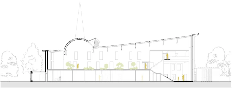 Aan de kopgevels van de kerk zitten originele gevelhoge glazen puien die prachtig uitzicht geven op aan de ene zijde de Geul en aan de andere zijde het karakteristieke centrum van Valkenburg. Deze ‘as’ hebben wij doorgezet in het ontwerp waarbij we het nieuwe volume hebben opgesplitst in twee delen. De verschillende functies bevinden zich op alle verdiepingen aan de langsgevels waardoor de as sterk wordt gemaakt. Door het maken van een lichtstraat wordt deze as nog eens extra benadrukt. Op deze manier blijft de kenmerkende hoogte van de kerk zichtbaar en blijven de doorkijkjes op de Geul en de historische binnenstad bestaan. Middenin deze as, ook wel de canyon genoemd, zit ook de oude koepel waardoor de ruimte zich nog meer opent en de oude functie zichtbaar blijft. De canyon is gevuld met groen en geeft een fijn uitzicht vanuit de behandelkamers die aan de zijde van de canyon zitten. Die via de nieuwe lichtstraat prachtig, indirect licht binnenkrijgen.