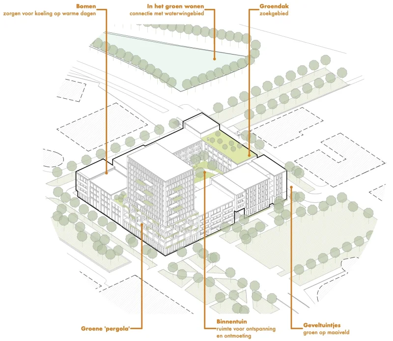 Om tegemoet te komen aan de duurzaamheidsambitie is gekozen voor het toepassen van circulaire materialen die recyclebaar of hernieuwbaar zijn. Natuurlijke materialen, zoals baksteen, blank materiaal, beton en blank hout met keurmerk die mooi verouderen worden tot in de finesse doorgevoerd. De gevels van het gebouw krijgen nestkasten en het groen rondom het gebouw zorgt voor verkoeling, bindt fijnstof en draagt bij aan de gezondheid van bewoners, gebruikers en bezoekers van het gebouw én de groene omgeving.